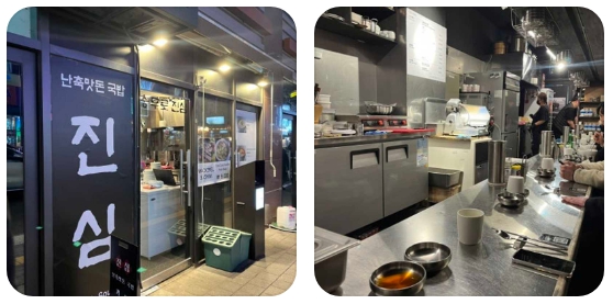 충무로 진심은 공간 그 자체로도 매력적인 곳입니다. 낡은 건물들 사이에서 세련된 1층 공간에 자리 잡은 이곳은 전통적인 국밥집의 이미지에서 벗어나 깔끔하고 현대적인 인테리어를 갖추고 있습니다. 혼밥족을 위한 바 테이블부터 삼삼오오 모여 앉을 수 있는 좌석까지 효율적으로 배치되어 있어, 바쁜 인쇄 골목 직장인들에게는 든든한 안식처가 되어줍니다. 오픈 주심 형태의 구조는 조리 과정을 투명하게 공개하여 위생에 대한 신뢰를 더합니다.